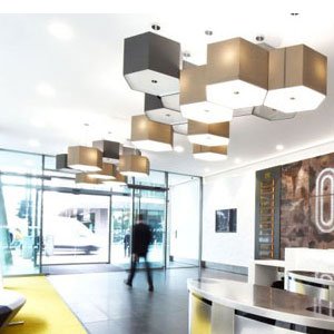 » Blog » fabric lamp shade in different colours to be a large chandelier for hotel lobby.